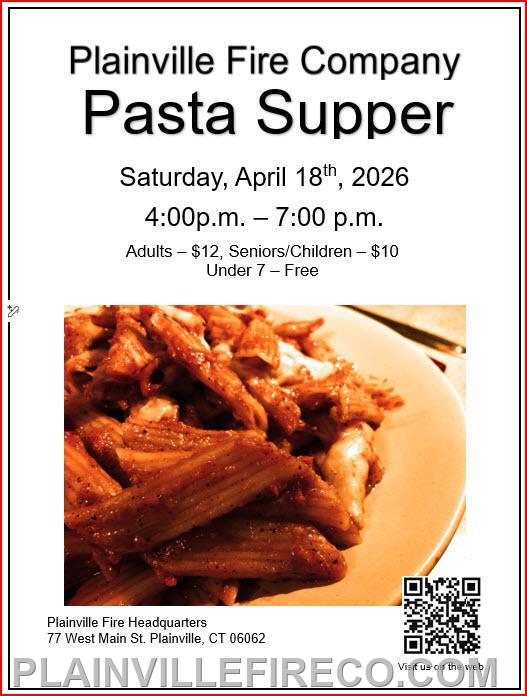 | The Plainville Fire Company is hosting our Spring Pasta Supper on Saturday, April 18th, 2026 from 4:00 - 7:00 P.M. at Plainville Fire Headquarters.